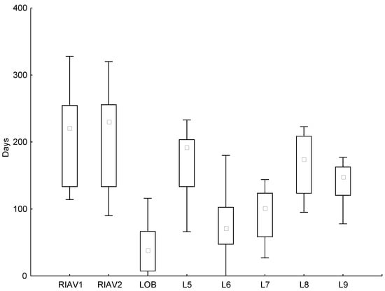 As marine biotoxin monitoring uses a sentinel or indicator species, the presence of biotoxins triggers the harvesting bans for the species existing in the production area. Only after a successful analysis of each individual species is the ban lifted for them [32], thereby potentially increasing the ban impacts. In this study, data from the bans of mussel harvesting was used for the production areas RIAV1, RIAV2, LOB, L5, L6, and L7; and data from donax clam bans were used for production areas L8 and L9. The variability of the number of days closed to harvesting during the decade 2011–2020 is illustrated in Figure 1.