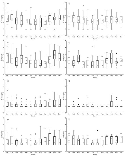Boxplot of monthly E. coli concentrations (Log MPN/100g), between 2011 and 2020, from (a) RIAV1; (b) RIAV2; (c) LOB; (d) L5; (e) L6; (f) L7; (g) L8; and (h) L9. (◻ Median; ⌶ Non-Outlier Range; ○ Outliers; * Extremes).