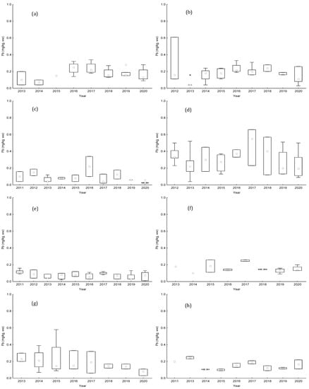Boxplot of annual lead (Pb) levels (mg kg−1), between 2011 and 2020, from (a) RIAV1; (b) RIAV2; (c) LOB; (d) L5; (e) L6; (f) L7; (g) L8; and (h) L9. (◻ Median; ⌶ Non-Outlier Range; ○ Outliers; * Extremes).