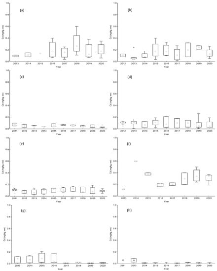 Boxplot of annual lead (Cd) levels (mg kg−1), between 2011 and 2020, from (a) RIAV1; (b) RIAV2; (c) LOB; (d) L5; (e) L6; (f) L7; (g) L8; and (h) L9. (◻ Median; ⌶ Non-Outlier Range; ○ Outliers; * Extremes).