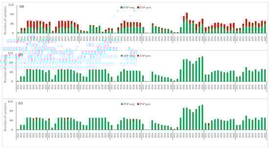 Occurrence of marine biotoxins in shellfish production areas between 2011 and 2020: (a) DSP, (b) APS, (c) PSP. Green indicates the number of samples below the legal threshold while red indicates the number of samples above the legal threshold.