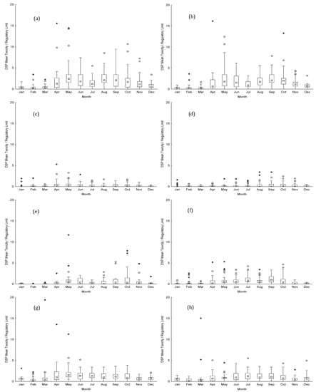 DSP concentration in relation to the EU regulatory limit, between 2011 and 2020, for mussels from: (a) RIAV1; (b) RIAV2; (c) LOB; (d) L5; (e) L6; and (f) L7—and for donax clams from: (g) L8 and (h) L9. (◻ Median; ⌶ Non-Outlier Range; ○ Outliers; * Extremes).