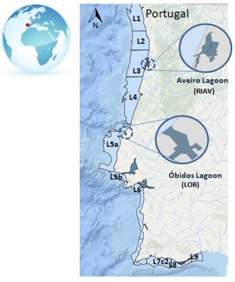 The Portuguese shellfish safety monitoring programme was implemented in 1986 [9,51]. Currently, the Portuguese monitoring programme comprises 40 classified shellfish-producing areas divided into 13 offshore production areas and 27 estuarine and lagoonar areas [31]. Data collected between 2011 and 2020 from Aveiro (RIAV1 and RIAV2) and Óbidos Lagoons (LOB), and the offshore areas L5, L6, L7, L8 and L9 were selected for this study in view of their relevance to shellfish production and impact of HABs (Figure 7).