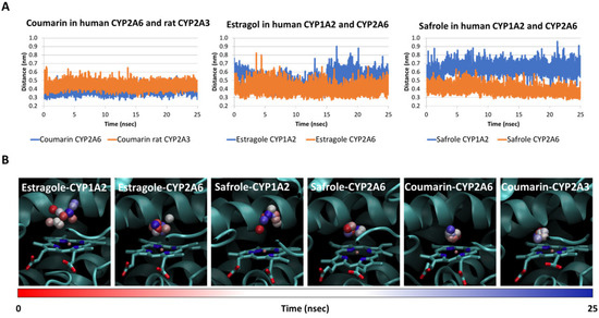 Molecular dynamics results of estragole and safrole in complexes with human CYP1A2 and CYP2D6 and coumarin in complexes with human CYP2A6 or rat CYP2A3. (A) Analysis of the distance between heme’s Fe and the atom undergoing the reaction and of coumarin in human CYP2A6 and rat CYP2A3, estragole in human CYP1A2 and CYP2A6, and safrole in human CYP1A2 and CY2A6. (B) Trajectory analysis of the complexes mentioned above. The proteins are represented by cartoons, while heme is represented by sticks. The atom undergoing the reaction is represented by spheres and a red-to-blue colour change indicates the stepwise changes of coordinates over time.