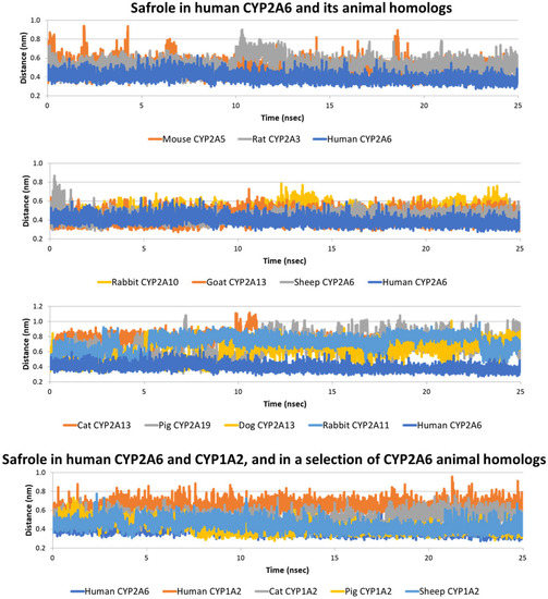 This result is in line with previous in vitro evidence describing the lower activity of rat hepatic microsomes compared to human liver microsomes to form 1′-hydroxy-safrole [12,23] and may propose a plausible mechanistic explanation (which could be also expected for mice). However, a diverse level of expression of human CYP2A6 and rat CYP2A3 in liver tissues could have a role in diversifying the formation of 1′-hydroxy-safrole in the two species as the hepatic expression of CYP2A3 in rats has been documented but not quantitatively compared to that of humans [24]. Nonetheless, the agreement between the computational results and the evidence previously collected (see above), along with the data collected for coumarin (see above; Section 2.1), further support the reliability of the procedure and suggest that these in silico analyses can provide important insights for other animal homologs. As shown in Figure 3 and Table 2, safrole in sheep CYP2A6, goat CYP2A13 and rabbit 2A10 showed dynamics of interactions, with interatomic distances between its atoms undergoing the reaction and the heme’s Fe, which were similar to that observed for human CYP2A6. This suggested that sheep CYP2A6, goat CYP2A13 and rabbit CYP2A10 may appreciably form 1′-hydroxy-safrole. It must be noted that, although the in silico analysis suggested safrole bioactivation, data for protein expression, which is, of course, required for bioactivation to occur, are still fragmentary and require further dedicated investigations. Conversely, the CYP2A6 homologs identified in cats, dogs and pigs and the 2nd homolog identified in rabbits (CYP2A11) showed a dynamic of interaction not in line with an appreciable formation of 1′-hydroxy-safrole. Indeed, the interatomic distances between the atom undergoing the reaction and the heme’s Fe were similar to that observed for the human safrole-CYP1A2 complex (i.e., not showing biotransformation in vitro [4]) and above the 0.53 nm threshold. Although the existence of other CYP2A6 homologs able to form 1′hydroxy-safrole cannot be excluded completely, our results suggest that for cats, dogs and pigs, a much less efficient formation of the proximate carcinogen can be expected, which may possibly translate to lower degrees of safrole toxicity. This cannot be concluded from the present in silico analysis as a CYP2A6 homolog-independent biotransformation may exist, but this study provides clear directions for further dedicated (in vitro) investigations.