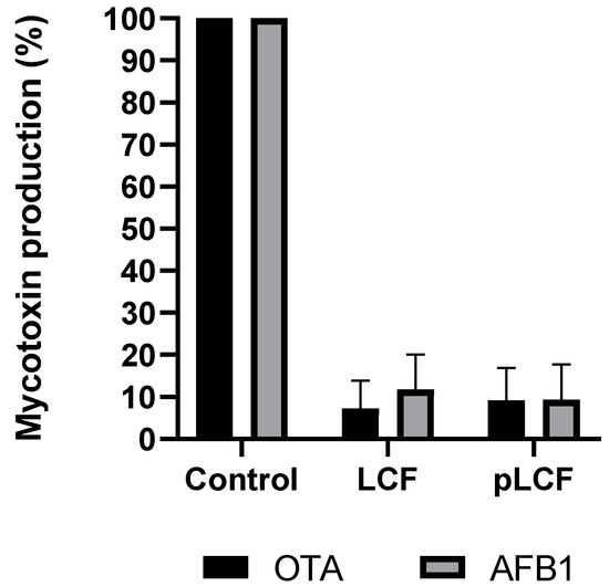 Comparison of the inhibition of biosynthesis of AFB1 and OTA in treatments with LCF and semipurified (pLCF) metabolite of S.C. Ailanto, compared with the control. Results are expressed as a percentage of mycotoxins produced relative to the control. The data are the mean ± SD of three different determinations of five separate experiments.