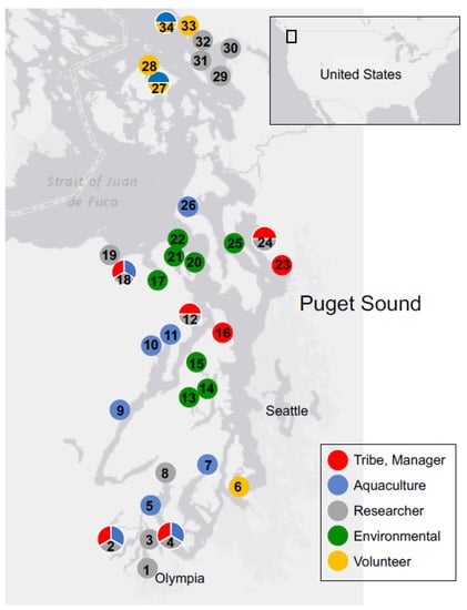 Numbered SoundToxins sampling sites. Partners are identified as Tribe and natural resource manager (red), aquaculturist (blue), research organization, including universities (gray), environmental learning center (green), and volunteer participants (orange). SoundToxins sites are: 1. Budd Inlet South, 2. Totten Inlet, 3. Budd Inlet North, 4. Nisqually Reach, 5. Spencer Cove, 6. Quartermaster Harbor, 7. Burley Lagoon, 8. North Bay, 9. Hama Hama, 10. Quilcene Bay, 11. Dabob Bay, 12. Hood Head, 13. Dyes Inlet, 14. Brownsville, 15. Liberty Bay, 16. Port Gamble, 17. Discovery Bay, 18. Sequim Bay South, 19. Sequim Bay North, 20. Mystery Bay, 21. Port Townsend, 22. Fort Worden, 23. Tulalip Bay, 24. Port Susan, 25. Camano Island, 26. Penn Cove, 27. Glenwood Springs, 28. East Sound, 29. Bellingham Bay buoy, 30. Fairhaven. 31. Gooseberry Point, 32. Birch Bay, 33. Blaine Fishing pier, and 34. Drayton Harbor. Two opportunistic sites in Willapa Bay on the outer coast of Washington are not shown. All tribes are co-managers of marine resources within their usual and accustomed areas and sole managers of reservation lands. Management partners not shown include WDOH, Washington Department of Fish and Wildlife and NANOOS. WSG is the current director of SoundToxins.