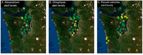 Example map for the reportable HAB genera Alexandrium, Dinophysis and Pseudo-nitzschia. Symbols correspond to the following cell threshold levels for: (A) Alexandrium, abundance above 100 cells/L (red), abundance between 1–99 cells/L (yellow), absent (green); (B) Dinophysis, abundance above 1000 cells/L (red), abundance between 1–999 cells/L (yellow), absent (green); (C) Pseudo-nitzschia, threshold levels were established to distinguish the risk between small and large cell type: small cell count greater than or equal to 1,000,000 cells/L or large cell count greater than or equal to 50,000 cells/L (red), small cell count below 1,000,000 cells/L and large cell count below 50,000 cells/L (yellow), absent (green). A gray dot indicates that data have not been entered for that site within the past 2 weeks. Required reporting for shellfish-killing HABs has recently been added to SoundToxins, and those maps are not shown here.