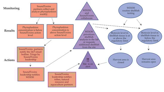The goal of the WDOH Marine Biotoxin Program (MBP) is to protect humans from illness and death caused by eating shellfish contaminated with biotoxins. The program monitors commercially and recreationally harvested molluscan shellfish, including clams, mussels, oysters, geoduck and scallops. In general, testing of shellfish for marine biotoxins by the WDOH occurs at 2-week intervals; however, some areas are monitored less frequently [6]. The SoundToxins partnership was established to provide routine phytoplankton data to alert the WDOH of HABs that could result in shellfish toxicity, especially during these interim periods when WDOH is not scheduled to monitor. SoundToxins sites were strategically established with WDOH input to focus on locations where HABs have historically occurred, where key shellfish resources are located or where additional sampling is needed. When SoundToxins documents a high risk of HABs, the number and variety of shellfish tested by WDOH often increases and is prioritized for that site (Figure 3).