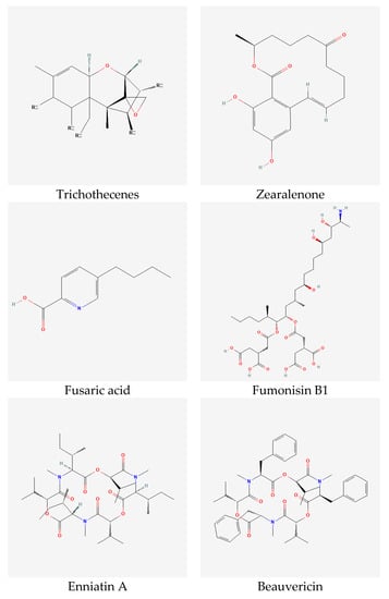 | Trichothecenes | Zearalenone | Fusaric Acid | Fumonisins | Emerging Toxins | |||||||||||||||||
