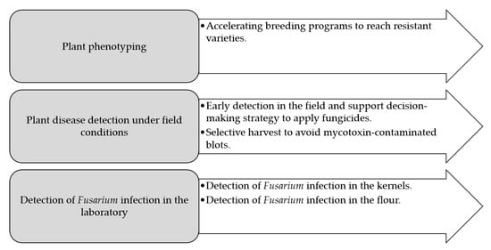 - Femenias, A.; Gatius, F.; Ramos, A.J.; Sanchis, V.; Marín, S. Use of Hyperspectral Imaging as a Tool for Fusarium and Deoxynivalenol Risk Management in Cereals: A Review. Food Control 2020, 108, 106819. [Google Scholar] [CrossRef]