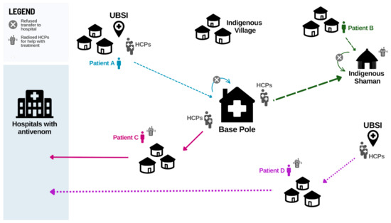 - Cristino, J.S.; Salazar, G.M.; Machado, V.A.; Honorato, E.; Farias, A.S.; Vissoci, J.R.N.; Neto, A.V.S.; Lacerda, M.; Wen, F.H.; Monteiro, W.M.; et al. A painful journey to antivenom: The therapeutic itinerary of snakebite patients in the Brazilian Amazon (The QUALISnake Study). PLoS Negl. Trop. Dis. 2021, 15, e0009245. [Google Scholar] [CrossRef]