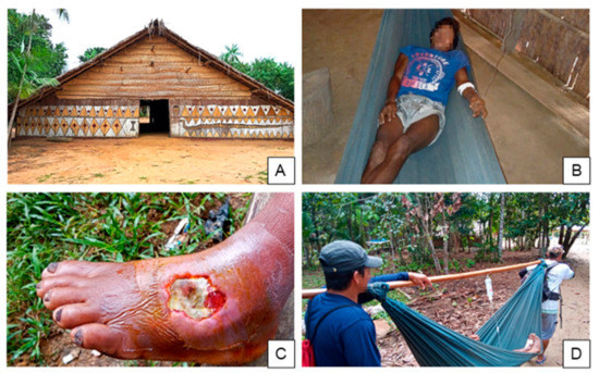 A case example of a care pathway for an indigenous snakebite patient. (A) A typical indigenous structure for patient accommodation duri›ng disease treatment and recovery in the forest. (B) Male SBE patient resting in the structure and undergoing traditional treatment. (C) Ulcer from snakebite observed in the left foot of the same patient, 12 days post-bite. (D) HCPs transporting the patient using a hammock to the base hub and then to the hospital to receive treatment.