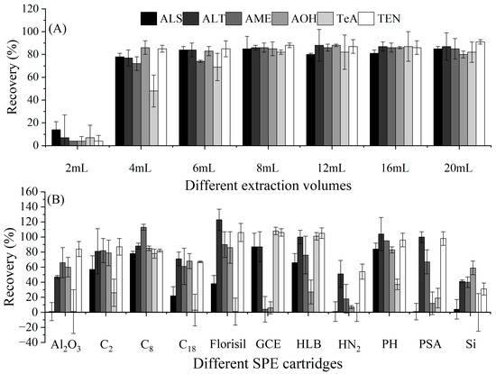 As shown in the literature and for the standards, SPE is a powerful clean-up tool in analytical methods [9,13,16,22]. Although some papers have described the application of SPE for the detection of ATs, to date, simultaneous analysis of all six major toxins via SPE has not been reported. Therefore, in this work, we attempted to select a suitable SPE column due to the change in the target object. Eleven kinds of commercial SPE columns were tested. As shown in Figure 2B, after clean-up using the SPE columns and elution with 2 mL of acetonitrile, except for the C8 columns, none of the 10 columns could achieve the simultaneous purification of six target compounds, attaining recoveries of 0.2–123.1%, which did not meet the requirements of the EU guidelines (70–120%). However, with the C8 columns, the recoveries (77.7–112.7%) of the six ATs were much better and met the requirements of analytical methods. Therefore, the C8 columns were selected as the clean-up tool.