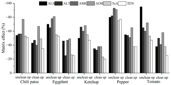 For validation, five typical solanaceous vegetables and vegetable products, namely chili paste, eggplant, ketchup, pepper, and tomato, were selected as the evaluation matrixes. Moreover, six ATs were isolated through chromatographic separation (Figure 3). As shown in Table 1, in different concentration ranges and matrixes, the target compounds exhibited a good linear relationship, with correlation coefficients exceeding 0.998. Then, for the MEs, as shown in Figure 4, the values in these matrixes indicated obvious matrix inhibition effects, and the recoveries in unpurified samples and purified samples were −94.7–−47.1% and −66.6–−20.5%, respectively. All the absolute values for the ME were significantly lower than those of the unpurified samples, proving that the proposed method had an obvious impurity removal effect. However, because the values exceeded ±20%, the matrix standard solution was indispensable for accurate quantitative analysis. The accuracy and precision were determined via the spiked recovery test. Table 1 showed that in the five matrixes, all the recoveries and RSDs were acceptable, reaching 72.0–107.4% and below 15.5%, respectively. Calculated according to three signal/noise ratios, the LODs of the six ATs ranged from 0.05–2 μg/kg in the five matrixes. The LOQ of AME was 5 μg/kg, and for other ATs, the LOQ was 2 μg/kg. Therefore, the validation results demonstrated that the proposed analytical method was acceptable and satisfactory, complying with EU criteria [31].