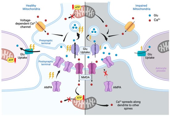 Glutamatergic synapse in healthy (left) and impaired (right) mitochondria. The synapse consists of three parts: on top—the presynaptic terminal, on the bottom—the postsynaptic region, on the side—a process of astroglia. In the presynaptic terminal, the mitochondrion provides energy for the reuptake of glutamate (Glu), previously released into synaptic cleft, the formation of vesicles containing Glu, and, finally, the release of neurotransmitters into the postsynaptic terminal, as shown in the figure. Ca2+ enters the presynaptic terminal through voltage-dependent ion channels; binds to synaptotagmin, a membrane-trafficking protein holding two calcium-binding domains; and thereby participates in the release of Glu. Healthy mitochondria regulate intracellular Ca2+. In case of disruption of the mitochondria, the energy supply of all presynaptic processes deteriorates and the levels of neurotransmitters decreases. Nevertheless, dysregulation of Ca2+ homeostasis at the initial stage increases the probability of transmitter release, thereby elevating its overall concentration at the synaptic cleft. Astrocytic leaflet provides the reuptake of Glu and regulates perisynaptic potassium levels. Impairment of the mitochondria in astrocyte processes violates reuptake of neurotransmitters. Its excess in synaptic cleft creates conditions for excessive excitation of the postsynaptic membrane and the effect of excitotoxicity. The main events of synaptic plasticity occur at the postsynaptic terminal. The largest and most active dendritic spines of mushroom type are supported by nearby shaft mitochondria clusters. The initial plasticity events are believed to be triggered by Ca2+ entry via N-methyl-d-aspartate (NMDA) channels. Elevated intra-spine Ca2+ levels activate the buffer protein calmodulin and corresponding kinases. Kinases phosphorylate existing α-amino-3-hydroxy-5-methyl-4-isoxazolepropionic acid (AMPA) receptors; promote the recruitment of extra-synaptic ones, which enhances the signal transduction; and further trigger long-term synaptic modifications. Calcium influx is also required to activate ATP production by local mitochondria. Leakage of calcium from mitochondria may be associated with its spread towards the neighboring spines and decrease in local ATP supply. Ultimately, the lack of energy support will weaken the synapse, reduce its plastic potential and create the conditions for loss of its head volume and mushroom shape, degradation, and/or pruning. Thunder symbol indicates level of consuming of ATP. Red arrow means increase of ATP production.