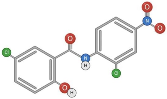 Niclosamide is a classic anthelmintic drug for the treatment of cestodosis, and is effective for infestations with Taeniarhynchus saginatus (beef tapeworm), Diphyllobothrium latum (broad fish tapeworm), and Hymenolepis nana (dwarf tapeworm). The anticestodic effect of niclosamide is manifested by the inhibition of oxidative phosphorylation and stimulation of adenosine triphosphatase activity in mitochondria [70]. There are other signaling pathways that can be affected by the drug [71], as well as a range of diseases in which the potential of niclosamide can be unleashed. These diseases are both viral (SARS-CoV, Flavivirus, Hepatitis C Virus, Ebola Virus, Human Rhinovirus, Chikungunya Virus, Human Adenovirus, and Epstein–Barr Virus) and non-viral (such as cancers and metabolic disorders) [72]. Niclosamide is a hydrophobic substance with low solubility and bioavailability (Figure 3); therefore, research is underway on chemical modifications of niclosamide to increase bioavailability and therapeutic efficacy [73].