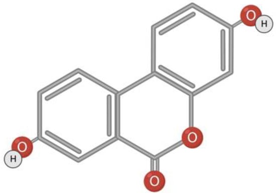 Urolithin A belongs to a class of substances with α-benzocoumarin in base (Figure 4). Urolithins are formed in the gut microbiota from naturally occurring polyphenols such as ellagitannin or ellagic acid [120,121,122]. The bacteria responsible for the conversion of polyphenols to urolithins in the human intestine is still unknown [120,123]. It is assumed that Gordonibacter urolithinfaciens and Gordonibacter pamelaeae are responsible for the synthesis of urolithin in the intestine [56,124]. Foods rich in metabolic precursors of urolithins are pomegranate, strawberries, walnuts, almonds, persimmons, raspberries, black raspberries, peaches, and plums [125,126,127].
