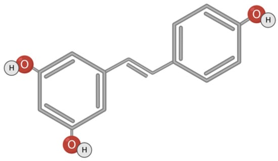 Resveratrol (trans-3,5,4′-trihydroxystilbene) is a non-flavonoid polyphenolic compound that has two phenolic rings connected to each other by an ethylene bridge (Figure 5). There are two isomeric forms of resveratrol: cis and trans. It is trans-resveratrol that has greater biological activity [132,133,134,135]. Trans-resveratrol is a photosensitive compound and converts to cis-resveratrol under irradiation [136,137]. This compound is found in grapes, peanuts, berries, in the bark of some plants, seeds, nuts, flowers, and in the plant Polygonum cuspidatum, used in Japanese folk medicine [135,138]. Polyphenols accumulate in plants in response to exogenous stress factors such as trauma, fungal infections, or UV exposure [134,139].