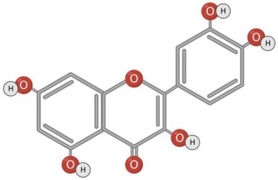 Quercetin is a flavonoid compound found in fruits, vegetables, berries, grapes, wine, various seeds, and nuts. Quercetin has a hydrophobic structure, and the presence of a hydroxyl group contributes to its reducing activity and, accordingly, antioxidant properties (Figure 6) [140,141,142]. In addition to antioxidant properties, quercetin is characterized by anti-inflammatory, antibacterial, antiviral, hepatoprotective, and immunomodulatory activity [96,143].