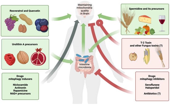 Effect of various compounds on mitophagy and neurodegenerative pathologies. The process of mitophagy is susceptible to external factors, including various substances. These substances are able to directly or indirectly influence through the metabolites of the intestinal microflora. Urolithin A, resveratrol, quercetin, and spermidine are known for their overall positive effects on human health in a wide variety of clinical areas, including cognitive function and memory. Their influence on mitophagy can be considered proven both in vitro and in vivo. In nature, these compounds and their metabolic precursors are found in various plant foods. These products can be recommended for patients at risk of neurodegenerative diseases as part of the diet. Clinical trials are underway to provide evidence of the effectiveness of these drugs in terms of mitophagy induction and neurodegenerative pathologies. Some drugs act as inducers of mitophagy and are suggested to be drugs for the treatment of neurodegenerative pathologies. These drugs include niclosamide, the anthelmintic drug, the antibiotic actinonin, the anticancer drug rapamycin, and NAD+ precursors (last three are not discussed in the text). The effectiveness of these drugs for the treatment of neurodegenerative pathologies by interfering with mitophagy remains to be proven. Sevoflurane and haloperidol have been isolated as inhibitors of mitophagy. Sevoflurane is an ether drug for inhalation anesthesia; its use in medical practice is accompanied by postoperative side effects associated with disruption of the nervous system. It is very likely that these disorders are directly related to the suppression of mitophagy in nerve cells. It has been proven that sevoflurane is able to suppress mitophagy. Haloperidol is an antipsychotic drug and is prescribed for psychiatric patients. Long-term use of haloperidol leads to neurotoxicity. Inhibition of mitophagy also makes some contribution to this neurotoxicity. There are data on the role of intestinal microflora in the process of mitophagy, including in the brain. Antibiotic use is associated with reduced gut microflora function, so we hypothesize that long-term antibiotic use and the resulting gut dysbiosis may lead to disruption of mitophagy in the brain with subsequent effects on neural function. The possible complications associated with the effect on mitochondria should be noted when prescribing any therapy. T-2 toxin is produced by certain types of Fusarium mycotoxins, which can affect various crops. Poisoning with this toxin contributes to neurological symptoms, and at the cellular level, T-2 contributes to mitochondrial damage with subsequent production of ROS. There is evidence that, in certain doses, this toxin is able to stimulate mitophagy, so it may in time become a drug for the treatment of neurodegenerative pathology. We hypothesize that there may be other food-associated fungal and bacterial toxins that can affect mitophagy in brain cells, including for a long time. Notation. Green color of line indicates generally healthy affection on nervous system. The gray—unknown or dosage-depending effect on health. The red means that the substance negatively affects the nervous system in general. Arrows correspond to regulation or stimulation of mitophagy, while rectangles endings suggest the inhibitory influence. Circle end represents unclear affectation on the process of mitophagy. “?” means unexplored or unproven effect.