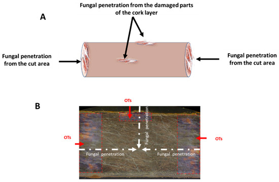 Putative mechanism of fungal and OT contamination of licorice root. (A) Direction of fungal penetration. (B) Thin section of licorice root showing fungal and OT contamination.