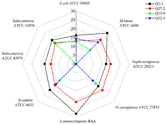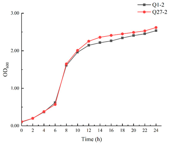 The growth curves of Q1-2 and Q27-2 cultured at 37 °C are shown in Figure 4. The growth curves of the two strains showed sluggish, logarithmic, and stable stages. The period of 0–4 h was the slow stage, 6–12 h was the logarithmic growth stage, and at 12 h the stable bacterial growth stage was entered.