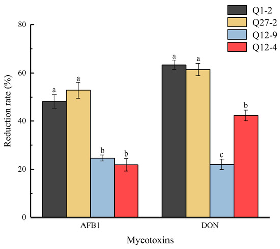 Reduction effect of strains on mycotoxins. Different lowercase letters (a–c) for the same mycotoxin indicate significant differences (p < 0.05).