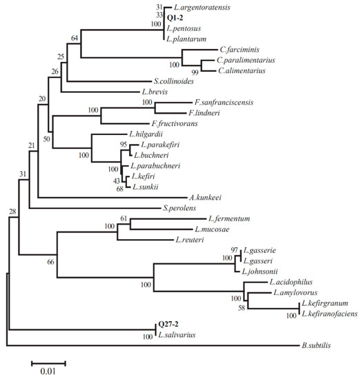 According to the results of antibacterial activity, a 16S rRNA gene analysis was performed on Q1-2 and Q27-2. BLAST was applied in order to compare the 16S rRNA gene sequences of the superior strains Q1-2 and Q27-2 in GenBank. The results showed that the 16s rRNA gene sequences of the two strains and multiple strains of Lactiplantibacillus were identified by more than 99%, and the phylogenetic tree was constructed by the neighbor-joining method (Figure 3). The two strains were placed in a cluster made up of the genus Lactiplantibacillus, so the strain Q1-2 was identified as L. plantarum and the strain Q27-2 was identified as L. salivarius.