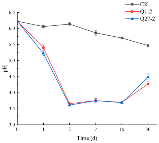 The pH value changes during fermentation are shown in Figure 5. All groups had lower pH values than the initial feed samples at 30 d of fermentation. Compared to the control group, the pH value of the treatment group supplemented with Q1-2, and Q27-2 rapidly decreased 3 days before fermentation and recovered 30 days after fermentation. In the control group, the pH value showed a slowly decreasing trend. On all fermentation days, the pH values of all treatment groups were significantly lower compared to those of the control group.