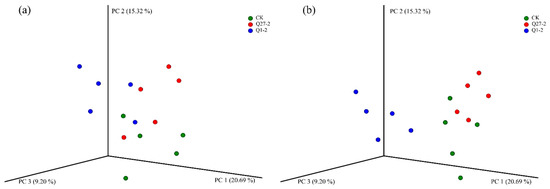 The principal co-ordinates analysis (PCoA) diagram explains the changes in microbial communities by analyzing the beta diversity index, as shown in Figure 6. Greater similarity in community composition among samples would result in a more clustered appearance in the principal component analysis diagram. In terms of bacterial composition, there was a certain distance between each treatment group; that is, there was a certain difference in bacterial composition between the control group and the treatment group. In terms of fungal composition, the treatment group with Q1-2 was significantly separated from the other groups, showing a significant difference.