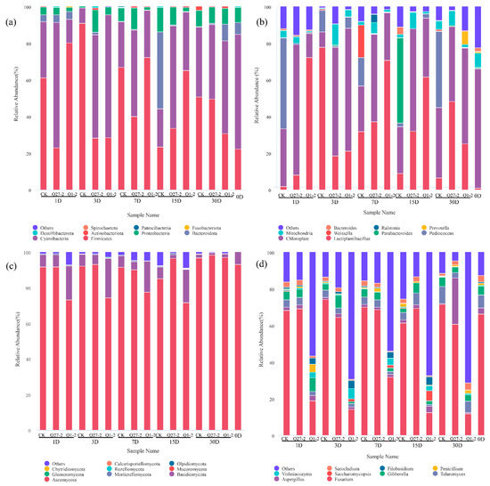 The relative abundance of bacteria and fungi during feed fermentation is shown in Figure 7. The bacterial community dynamics of fermented feed at the phylum level are shown in Figure 7a. In the original sample, Firmicutes (22.24%) and Cyanobacteria (62.59%) were dominant at the gate level. In the fermentation process, Firmicutes and Cyanobacteria were dominant in all groups, but the specific community groups were affected by fermentation treatment. The community composition changed with the fermentation process. The Q1-2 group showed a significantly higher relative abundance of Firmicutes compared to other treatment groups on the 15th day, while the control group exhibited a significantly higher relative abundance of Bacteroidota compared to other treatment groups. At the end of fermentation, the relative abundance of Firmicutes in the Q1-2 group was lower than that in the different treatment groups. However, on the 30th day, the relative abundance of Firmicutes increased in all treatment groups compared to the unfermented sample.