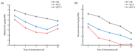 The changes in mycotoxins in the feed during fermentation are shown in Figure 8. The Q1-2 and Q27-2 groups showed lower levels of the mycotoxins AFB1 and DON compared to the control group. The contents of two mycotoxins in the Q1-2 group were lower than in the Q27-2 group, which was the lowest among the three treatment groups. As shown in Figure 8a, AFB1 content showed a downward trend in the first 15 d and continued to decline in the control group at 30 d, but increased in the treatment group with added strain. The change in DON content is shown in Figure 8b. The DON content in all treatment groups showed a decreasing trend with time, except for a slight increase in the Q1-2 group between 15 d and 30 d.