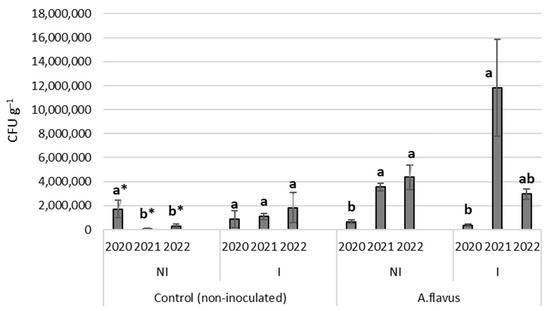 During the period of analysis, the mould colony counts on non-inoculated (Control) and artificially inoculated (with toxigenic A. flavus) ears under rain-fed (NI) and irrigated (I) conditions were detected. Irrigation produced significant differences (p < 0.05) in mould CFU g−1 in the three examined years (Table 1). Mould concentration positively correlated with irrigation for both control and inoculated plants. The fungal occurrence in irrigated plots was almost double that in non-irrigated ones. Under natural conditions, the infection by A. flavus is also influenced by environmental conditions (temperature, precipitation, humidity) and the presence of insects and competitor fungi. In the case of artificial inoculation, the isolates are embedded under the husks, where the conditions (temperature, aw) are optimal for their further development. In the control treatment, the number of mould colony-forming units was between 3.3 × 104 CFU g−1 and 4.7 × 106 CFU g−1, and, in the case of artificial infection, these values were between 4.5 × 105 CFU g−1 and 1.7 × 107 CFU g−1, reflecting the success of contamination with A. flavus.