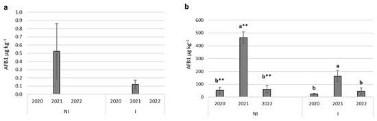 Aflatoxin concentration differences between the examined years in the control (a) and inoculated (b) treatments. p < 0.05, ** p < 0.01; different letters indicate significant differences between values; NI—non-irrigated, I—irrigated; vertical lines represent the SD of the mean.