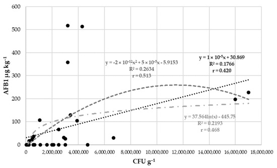 The correlation between fungal contamination and AFB1 content was examined during the three years (Figure 3). Linear, logarithmic, and polynomial regression was used to find the highest correlation between variables. Based on the results, 17.66–26.34% of the fungi were able to produce aflatoxin.