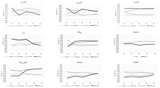 During the reproductive phase of maize growth, the strength of the relationship between the climatic parameters and the mould count was found to be varying with time and treatment. In the case of maximum temperature, Pearson’s correlation coefficient (r) ranged from −0.4 to 0.6, with a fairly uneven course. As an exception, the number of Tmax ≥ 35 °C days showed a steady, medium-strong relationship with mould count, with a large difference between the control (zero to slightly negative r) and the inoculated (pronounced positive r) treatments. Similar (r ≈ 0.4–0.6) values were found with the inoculated treatments in the case of the daily mean temperature; however, the correlation changed to slightly negative from R5. With the number of days with minimum values of relative humidity ≤ 40%, r slightly exceeded 0.5 in the inoculated treatments, although the correlation was initially negative in the upper canopy zone in the R2 and R3 stages. The length of humid periods, represented by the duration of RH ≥ 70% and 90%, typically showed a weak positive or zero relationship in the control groups and a weakening negative correlation in the inoculated treatments over the R2-R6 period (Figure 4).