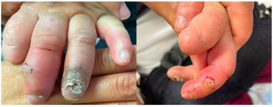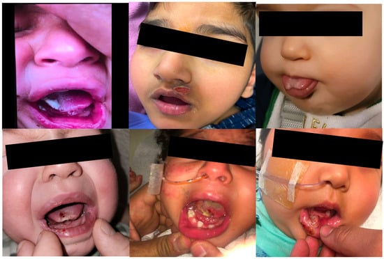Fifteen patients had utilized other treatments for SIB, with the most common being physical restraints (often using multiple types) (Table 2). All treatments were ineffective or poorly tolerated due to adverse effects. Two patients had not tried other treatments and had severe and forceful whiplash neck extension tics. Only one patient underwent behavioral modification therapy, which resulted in no improvement of SIB. Sites and dosing of BoNT were chosen based on the involved muscles in the SIB as well as estimated muscle mass and force of muscle contraction (Table 3 and Table 4) [17,18,19]. All patients who received BoNT to facial muscles suffered from self-injurious biting leading to injuries of the tongue, lip, and fingers (Figure 2 and Figure 3). All patients with self-injurious biting required BoNT to bilateral masseter (range of 80–110 units) and bilateral temporalis (range of 35–80 units) (Table 4). All patients receiving BoNT for self-injurious biting demonstrated meaningful benefit with no further injuries from biting during the duration of BoNT action (Table 3). Although dosing regimen was not planned using weight-based calculations, total units administered per kilogram for patients with self-injurious biting ranged from 10.9 to 31.7 U/kg (average 17.6 U/kg). There were no adverse effects and all patients received repeat injections approximately 3 months following initial injections. One patient required tooth extraction due to early wearing off (duration of effect approximately 8 weeks) despite escalating doses.