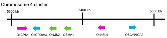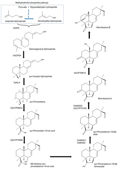 Cytochrome P450 enzymes (CYPs) are involved in the further metabolism of syn-pimaradiene. OsCYP99A3 oxidizes the C19 methyl of syn-pimaradiene into syn-pimaradien-19-oic acid [118,119], and OsCPY76M8 then hydroxylates its C6 position into 6β-hydroxy-syn-pimaradienon-19-oic acid, followed by the spontaneous closure of the ring between C19 and C6, which forms syn-pimaradienon-19,6β-hemiacetal [120]. Momilactone synthase (OsMS1 or OsMS2) converts the C19 hydroxyl group into a ketone to form syn-pimaradienon-19,6β-olide [120]. OsMS2 (or OsCPY701A8) then catalyzes C3 hydroxy into a ketone, forming momilactone A [120]. C20 hydroxylation of momilactone A by OsCP76M14 leads to the spontaneous closure of the hemiacetal ring and forms momilactone B [120,121]. The momilactone-synthesis-related genes OsCPS4, OsKSL4, CYP99A2, CYP99A3, OsMS1 and OsMS2 were reported to be located on chromosome 4 in plastids of rice cells [32,122] (Figure 3), which indicates that momilactones may play an important ecological role in rice evolution because of the presence of a dedicated biosynthetic gene cluster in the rice genome.