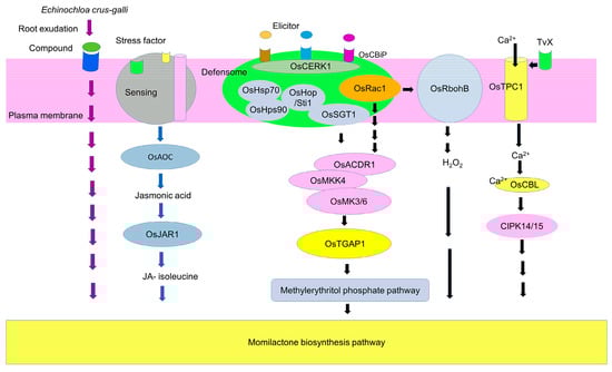 The generation of elicitor fragments after pathogen and insect attacks may occur through the induction of chitinase and β-1,3-glucanase [143,144]. Elicitor fragments such as N-acetylchitooligosaccharide induced the formation of hetero-oligomer complexes of OsCEBiP (chitin elicitor binding protein) and OsCERK1 (chitin elicitor receptor kinase) [145]. OsCERK1 is part of the defensome complex at the plasma membrane (Figure 4). The defensome contains OsHsp70 (heat shock protein 70), OsHps90, OsHop/Sti1 (Hsp70/Hsp90 organizing protein/stress-induced protein 1), OsSGT1 (suppressor of G/two allele of Skp1) and OsRAR1 (required for Mla12 resistance) as molecular chaperone proteins and co-chaperon-like proteins [146,147,148]. OsRac1 (small-specific Rho-type GTPase), which is another important component, may cause mitogen-activated protein kinase (MAPK) signal cascades [149]. The earliest MAPK signaling step is OsACDR1 (accelerated cell death and resistance 1), followed by OsMKK4 and then OsMK3 and/or OsMK6 [150,151]. OsTGAP1 (TGA factor for phytoalexin production 1) may then induce the methylerythritol phosphate pathway and the expression of momilactone biosynthetic genes, including OsKSL4 [152,153].