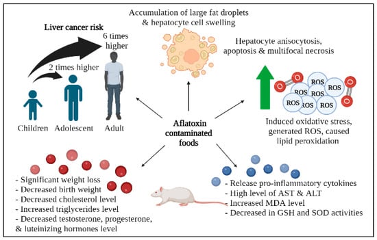 A schematic representation of health-related risks for humans and animals upon dietary AF exposure. Generally, exposure to AF can increase liver cancer risk, induce oxidative stress, manipulate the biochemical profile, and cause changes to hepatocyte cells. Created with BioRender.com (accessed on 7 November 2022).