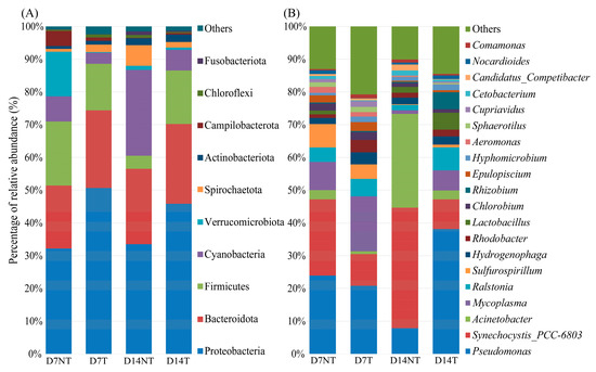 Relative abundance of each group of gut microbes at the phylum (A) and genus (B) levels. Abbreviations: D7NT, day 7 of the non-toxic cyanobacteria group; D7T, day 7 of the toxin-producing cyanobacteria group.