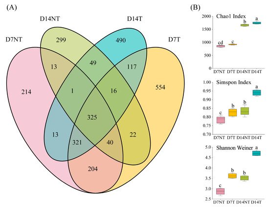 The results of a Venn analysis showed that 890 (48.37%) ZOTUs were common to the two groups on day 7, and 241 (13.10%) and 709 (38.53%) ZOTUs belonged uniquely to the D7NT and D7T groups, respectively. However, only 391 (22.92%) ZOTUs were shared by the two groups on day 14, and 374 (21.92%) and 941 (55.16%) ZOTUs were uniquely classified into the D14NT and D14T groups, respectively (Figure 2A). The results showed that the Chao1 index of the D14T group was significantly higher than that in the D14NT group (ANOVA, p < 0.05; Figure 2B), and the diversity indices (Simpson and Shannon) were significantly higher in the T group than those in the NT group at two time points (ANOVA, p < 0.05; Figure 2B).