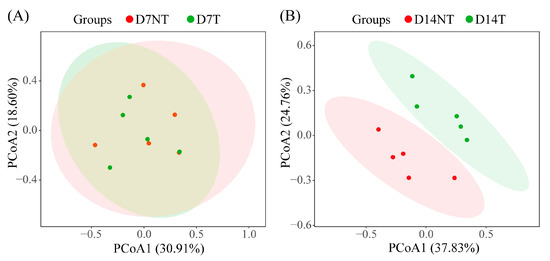 PCoA plots of the gut microbiota in both groups on day 7 (A) and day 14 (B). Ellipses indicate 95% confidence interval, and the percentages in parentheses are the proportion of variation explained by the PCoA axis.