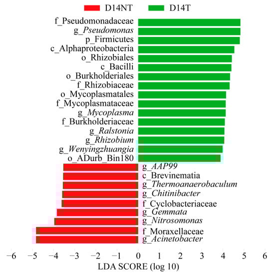 To further identify statistically significant biomarkers in the NT and T groups, LEfSe analysis based on the bacterial taxon was performed. Our results showed no enriched bacteria in the two groups on day 7. However, 25 biomarkers (LDA score > 3.5) were screened in the two groups on day 14 (Figure 4). Specifically, nine taxa were abundant in the D14NT group, including the family Moraxellaceae and the genera Acinetobacter, Nitrosomonas, and Gemmata, whereas 16 taxa were enriched in the D14T group, including the phylum Firmicutes, the class Bacilli, the family Pseudomonadaceae, and the genera Pseudomonas and Ralstonia. The heat map showed that Pseudomonas and Ralstonia were most abundantly represented in the D14T group, whereas Acinetobacter was most abundant in the D14NT group (Figure 5A). To further test whether there was a significant difference in the proportion of the relative abundances of these three biomarkers between groups, a one-way ANOVA with Holm–Sidak’s multiple comparisons test was performed. The results showed that there was no significant difference in the relative abundance of Pseudomonas, Ralstonia, and Acinetobacter between the D7NT and D7T groups (ANOVA, p > 0.05; Figure 5B–D). However, there was a significantly higher percentage of Pseudomonas and Ralstonia in the D14T group compared with the D14NT group (ANOVA, p < 0.05; Figure 5B,C). The relative abundance of Acinetobacter in the D14NT group was significantly higher than that in the D14T group (ANOVA, p < 0.05; Figure 5D).