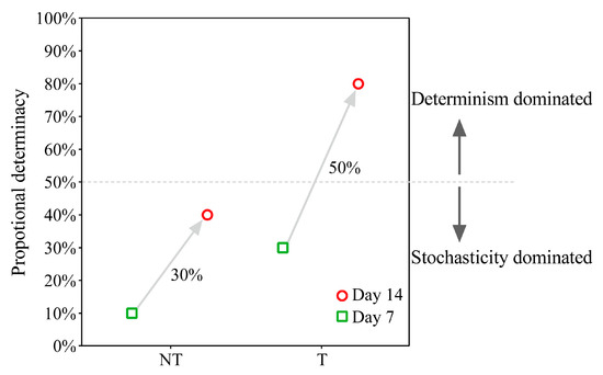 Changes in the proportion of deterministic and stochastic processes in the community assembly of the two groups of intestinal microorganisms. The gray dashed line in the figure indicates the equal role of both. Above or below the line represents the dominance of deterministic or stochastic processes, respectively. The percentage next to the gray arrow in the graph indicates the increase in the deterministic process.