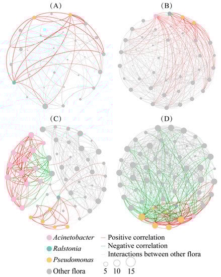 Co-occurrence network map for ZOTUs at the genus level in both groups. (A) D7NT group; (B) D7T group; (C) D14NT group; (D) D14T group. A connection stands for a strong (Spearman’s |r| ≥ 0.7) and significant (p < 0.05) correlation. The genera Pseudomonas, Ralstonia, and Acinetobacter are colored in orange, green, and pink, respectively, and the remaining nodes are colored in grey. The size of the nodes represents the degree, and the red and green lines represent positive and negative correlations, respectively. The thickness of the line represents the strength of correlation between the nodes.