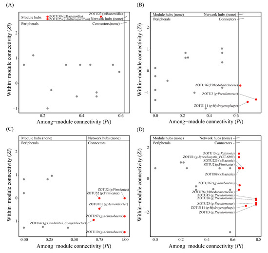 To further evaluate the topological role of identified nodes in the network, the within-module connectivity (Zi) and among-module connectivity (Pi) values were used to separate network nodes into four ecological modules, including module hubs, network hubs, peripherals, and connectors. We performed Zi-Pi analysis for the D7NT, D7T, D14NT, and D14T groups, respectively. Our results showed that there were three network nodes that were assigned to module hubs in the D7NT group (Figure 8A), and three network nodes were assigned to connectors in the D7T group, including one connector clustered to Pseudomonas (Figure 8B). Six network nodes were identified as connectors in the D14NT group, including three connectors clustered to Acinetobacter (Figure 8C), and twelve network nodes were identified as connectors in the D14T group, including four connectors clustered to Pseudomonas and one connector clustered to Ralstonia (Figure 8D).