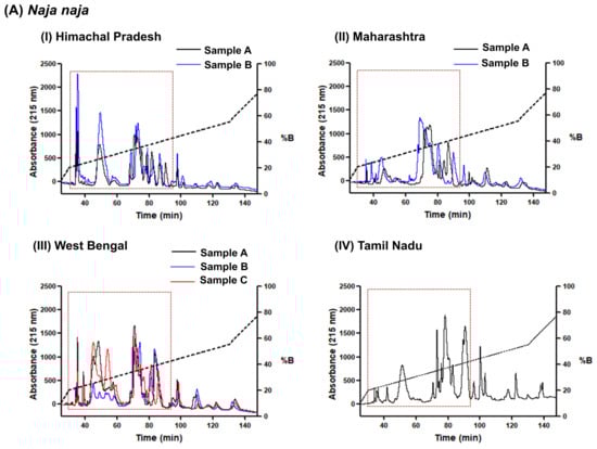 Within-locality among individuals: The HPLC protein profiles of adult N. naja individuals from the same localities of West Bengal and Maharashtra were found to be identical in terms of protein peaks eluted, but remarkable differences in the relative absorbance of the peaks were observed (Figure 2A). However, individual N. naja venoms sourced from Chamba District of Himachal Pradesh presented similar profiles under identical chromatographic conditions.