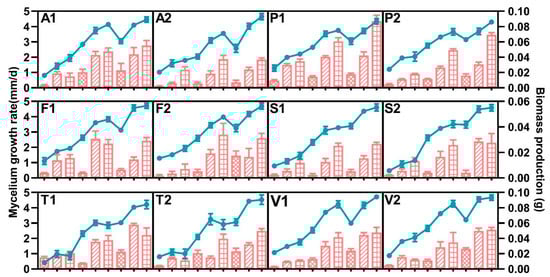 A 5 mm diameter agar disc from the margin of a fresh colony was transferred and inoculated onto the center of each plate. Inoculated plates were incubated at 20, 25, and 30 °C for 7, 14, and 21 days. Three biological replicates were conducted for each experimental condition. Two diameters of the colonies were measured at right angles every day until the colony reached the edge of the plate. The radii of the colonies were plotted against time, and linear regression was used to obtain the growth rate (mm/day). After 7 days of incubation, the whole mycelium was removed, frozen at −80 °C, lyophilized, and weighed as the biomass.